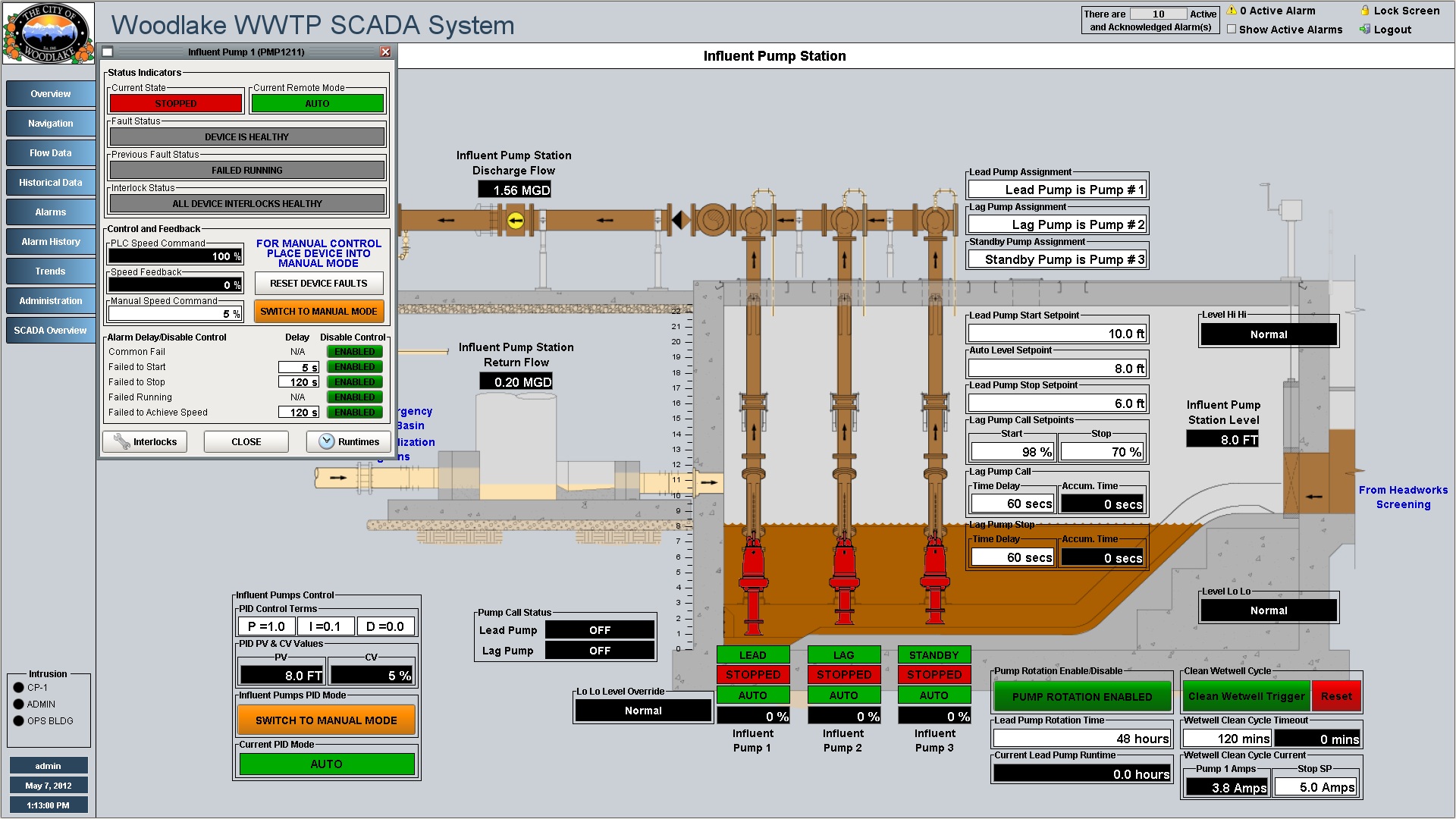 Influent Pump Station overview displays prominent information directly on the screen, individual device controls can be accessed by clicking the required device.