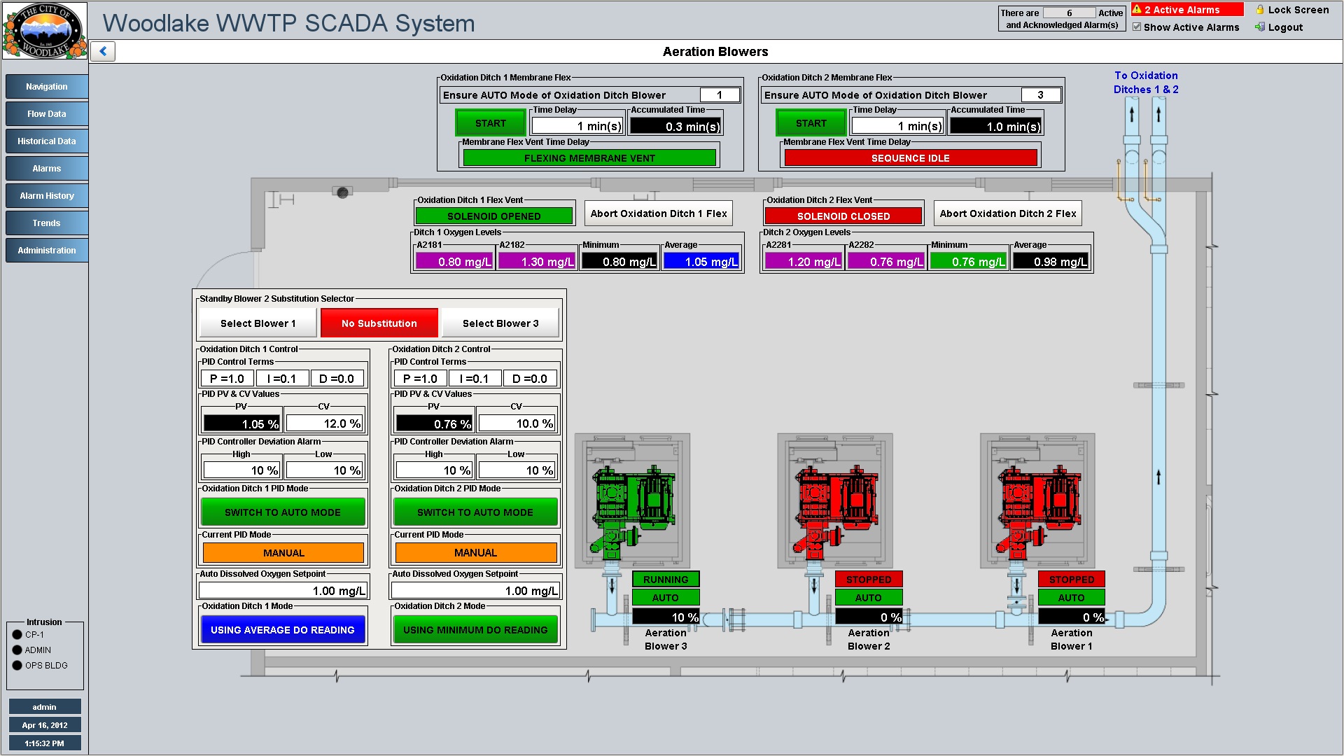 Aeration Blowers overview displays device status and process instrument values. Blower arrangement and high level controls displayed directly on overview graphic.