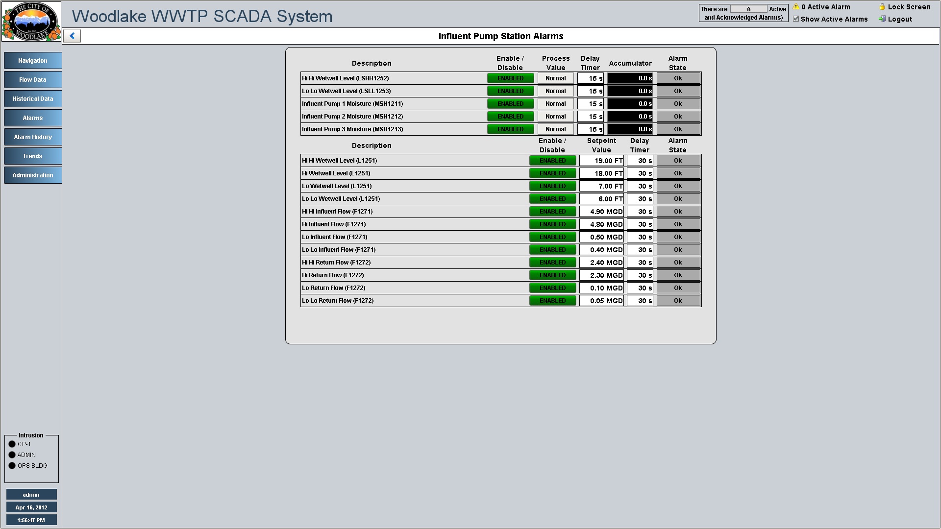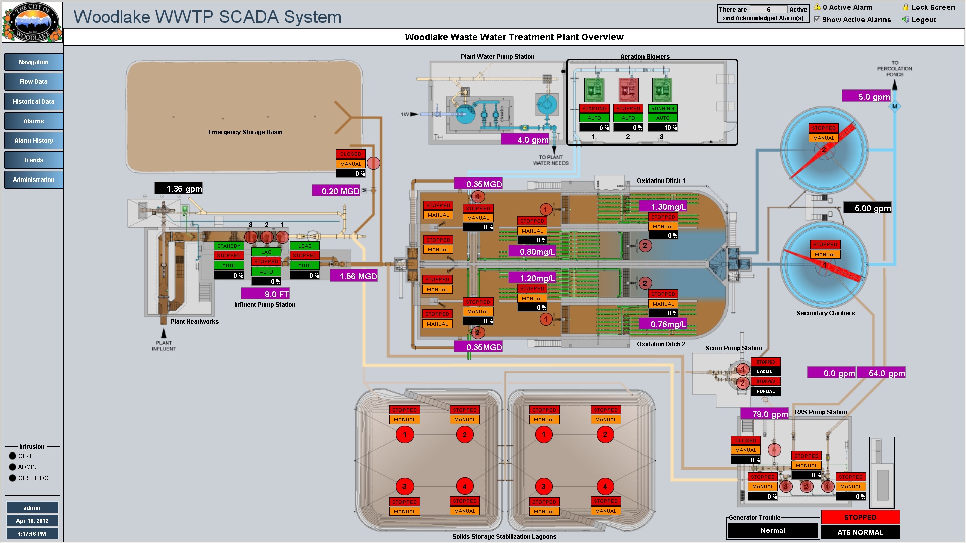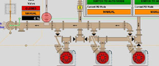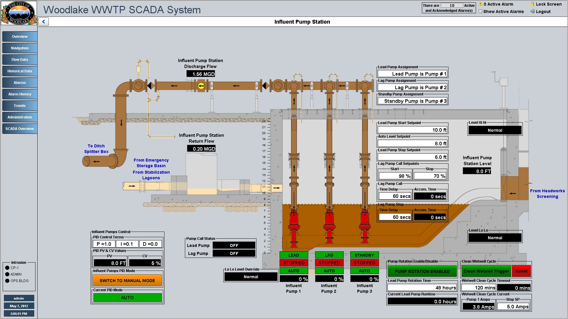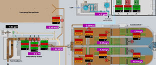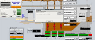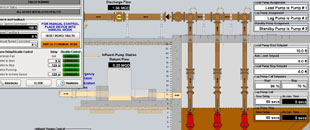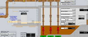 Influent Pump Station overview displays prominent information directly on the screen, individual device controls can be accessed by clicking the required device.