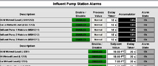 Alarm configuration displays device and process alarm limits, delays, alarm status and enable/disable controls by process area.