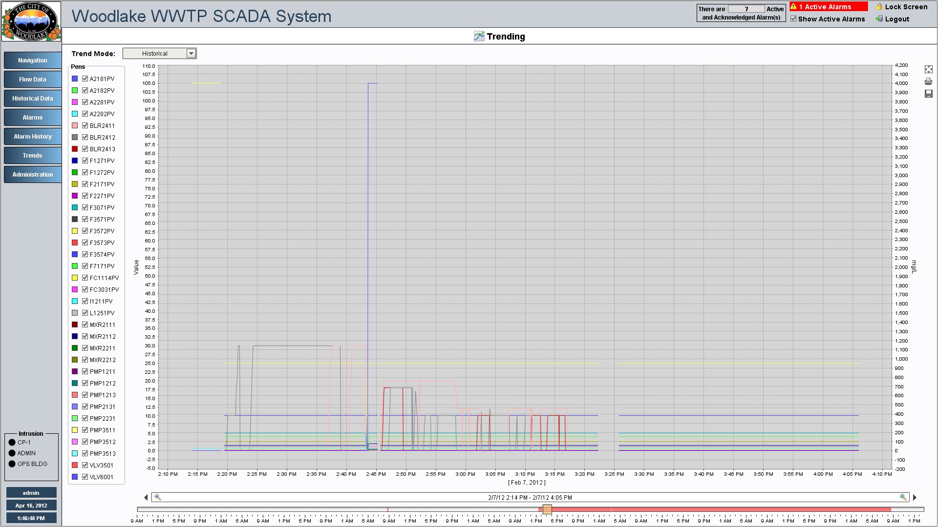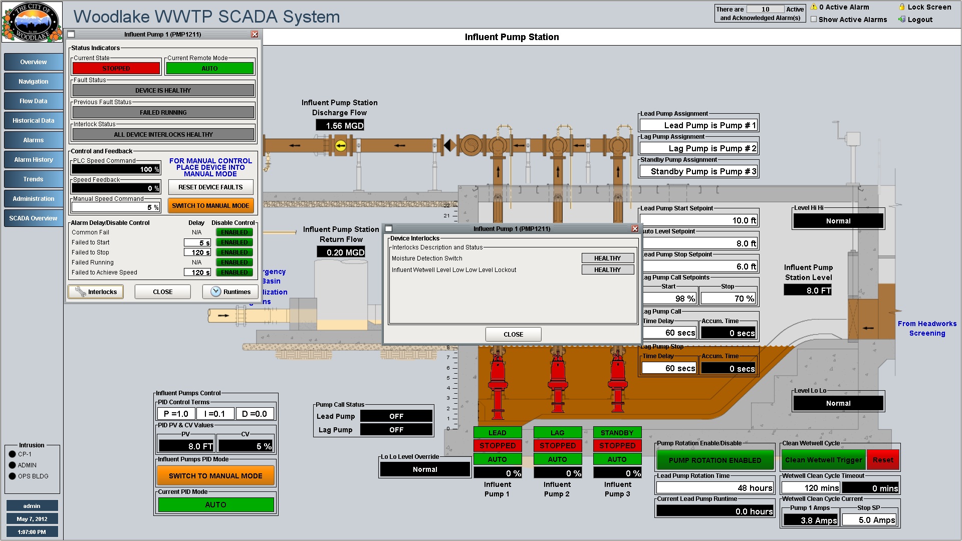 Influent Pump Station overview with influent pump interlock pop-up. Pop-up provides additional information related to any device interlocks preventing the pump from operating.