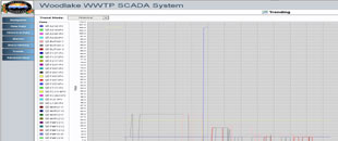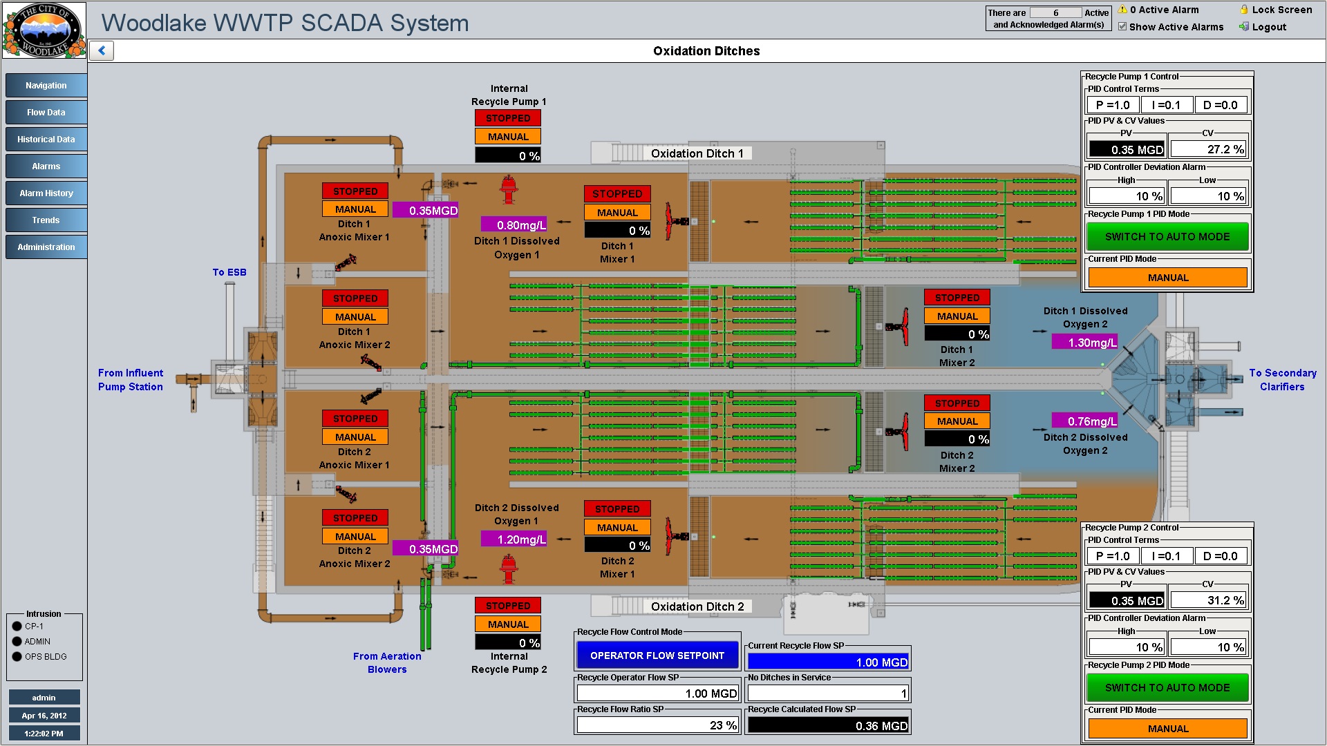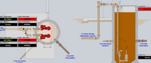 Oxidation ditch overview displays device status and process instrument values. High level controls displayed directly on overview graphic.