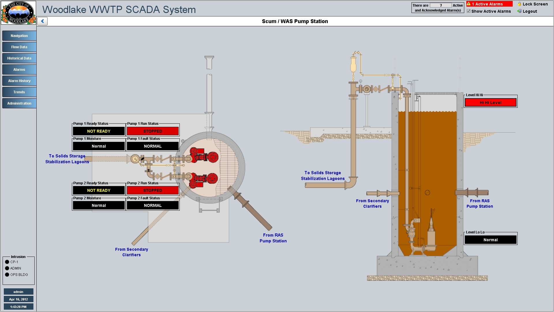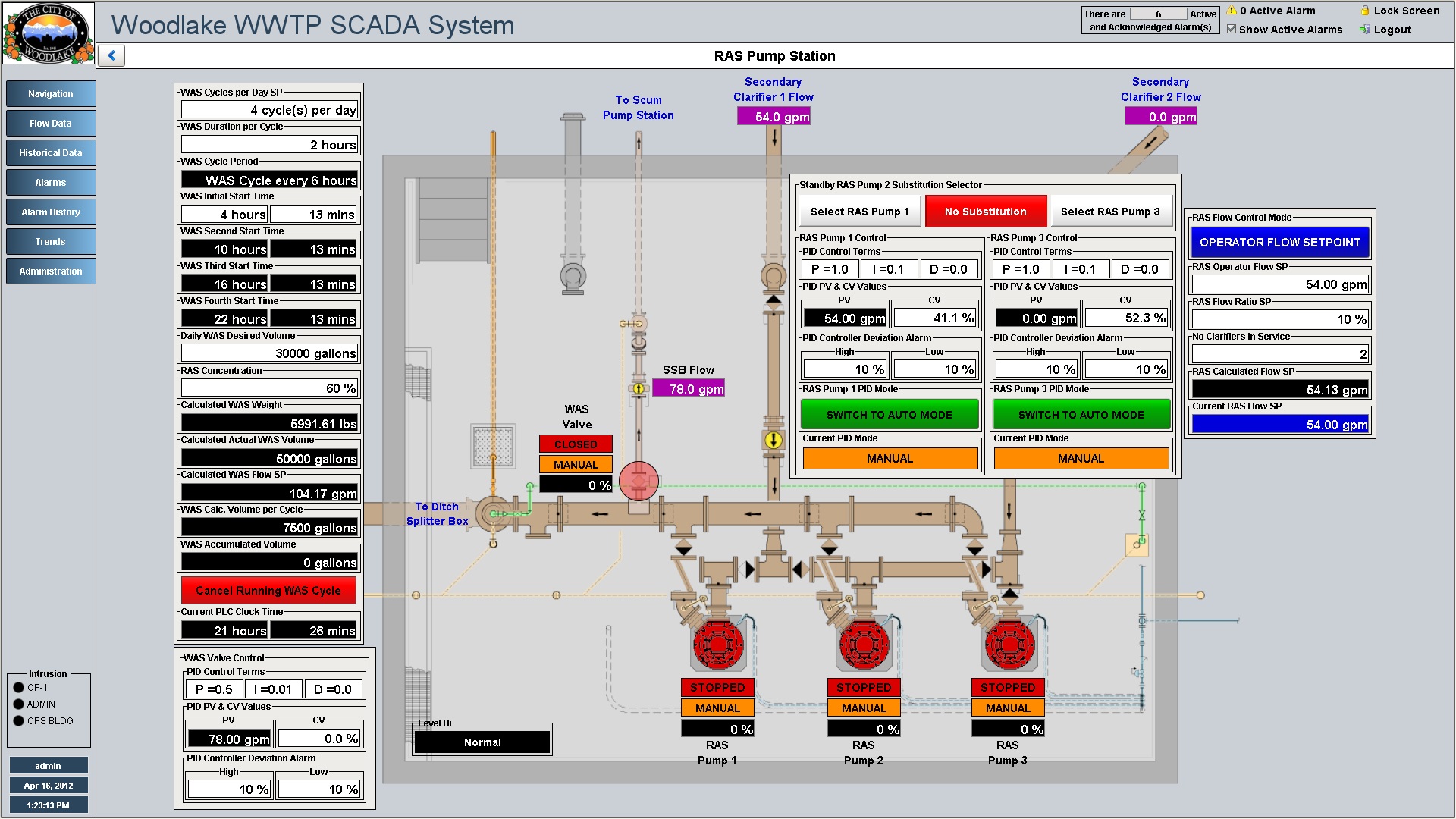 RAS Pump Station overview displays device status and process instrument values. RAS Pump arrangement and high level controls displayed directly on overview graphic.