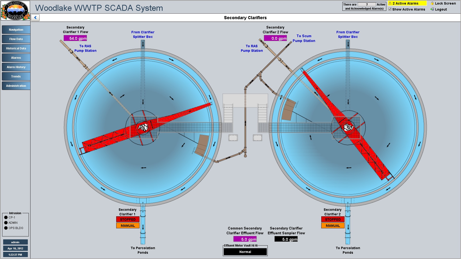 Secondary Clarifiers overview displays device status and allows control pop-ups to be opened.